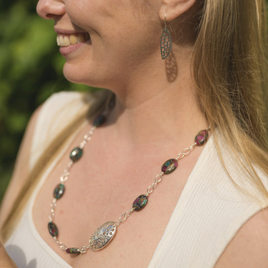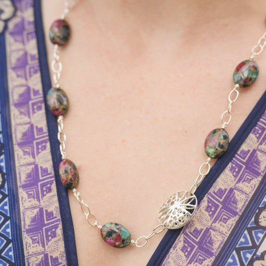 Butterfly halskæde med flerfarvede glassten, mellemlang