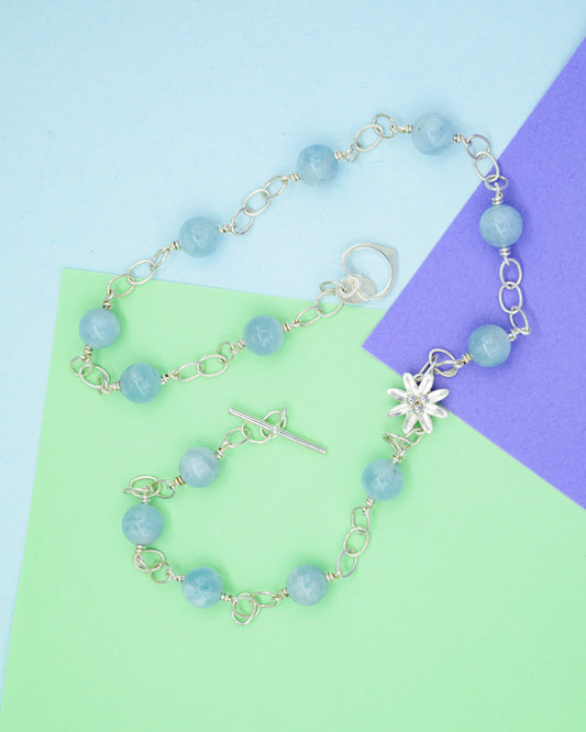 Halskæde med sten af akvamarin og en sølvblomst