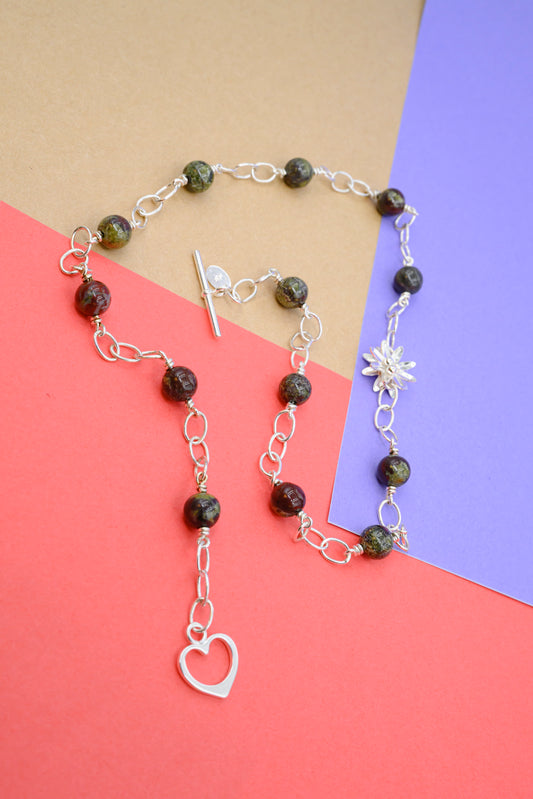 Halskæde med sten af drageblodsjaspis og en sølvblomst