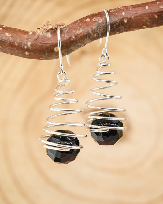 Spiral earrings with faceted onyx beads