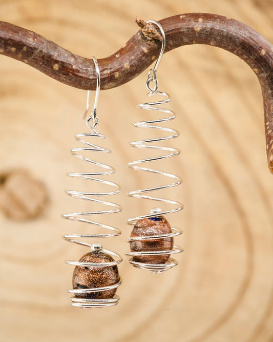 Long spiral earrings with brown glass beads