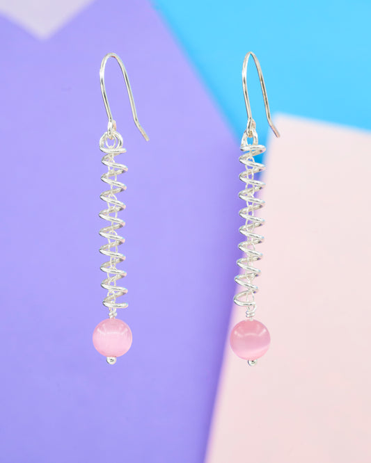 Narrow spiral earrings with pink cat's eye