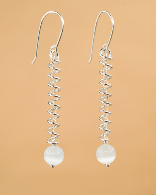 Narrow spiral earrings with white cat's eye