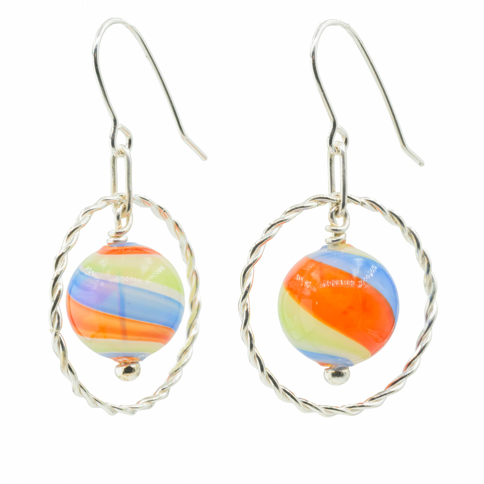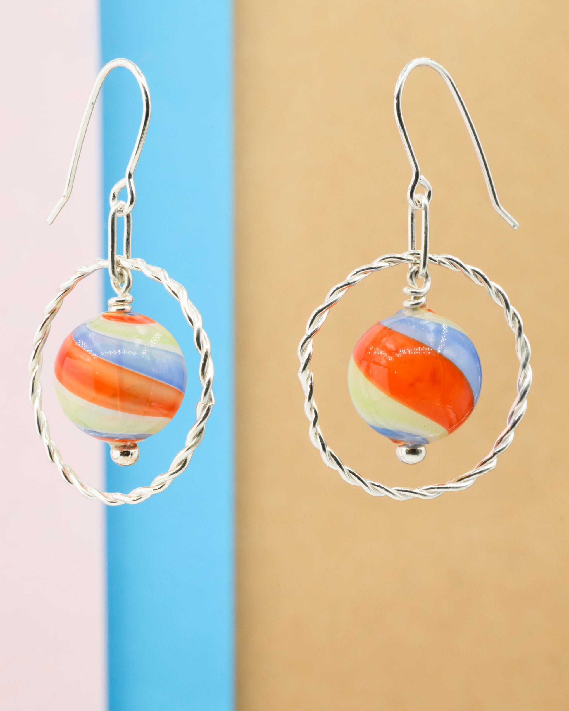 Earrings with striped glass beads in a twisted silver circle and suspension. Festive earrings that not only delight the wearer, but also attract attention from those around them.