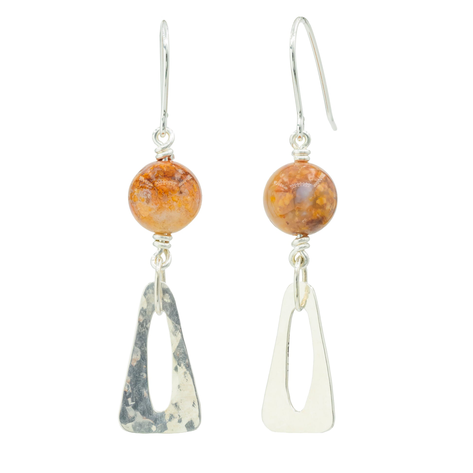 These unique geometric earrings are hand-hammered from sterling silver, with agate stones in warm, brown-orange hues. This type of agate is also called fossil flower agate, or blomsteragat, in Danish. This stone is said to help you reach your full potential, protect you from doubt and uncertainty, and provide peace in the midst of changing times. In short - it helps you flourish!