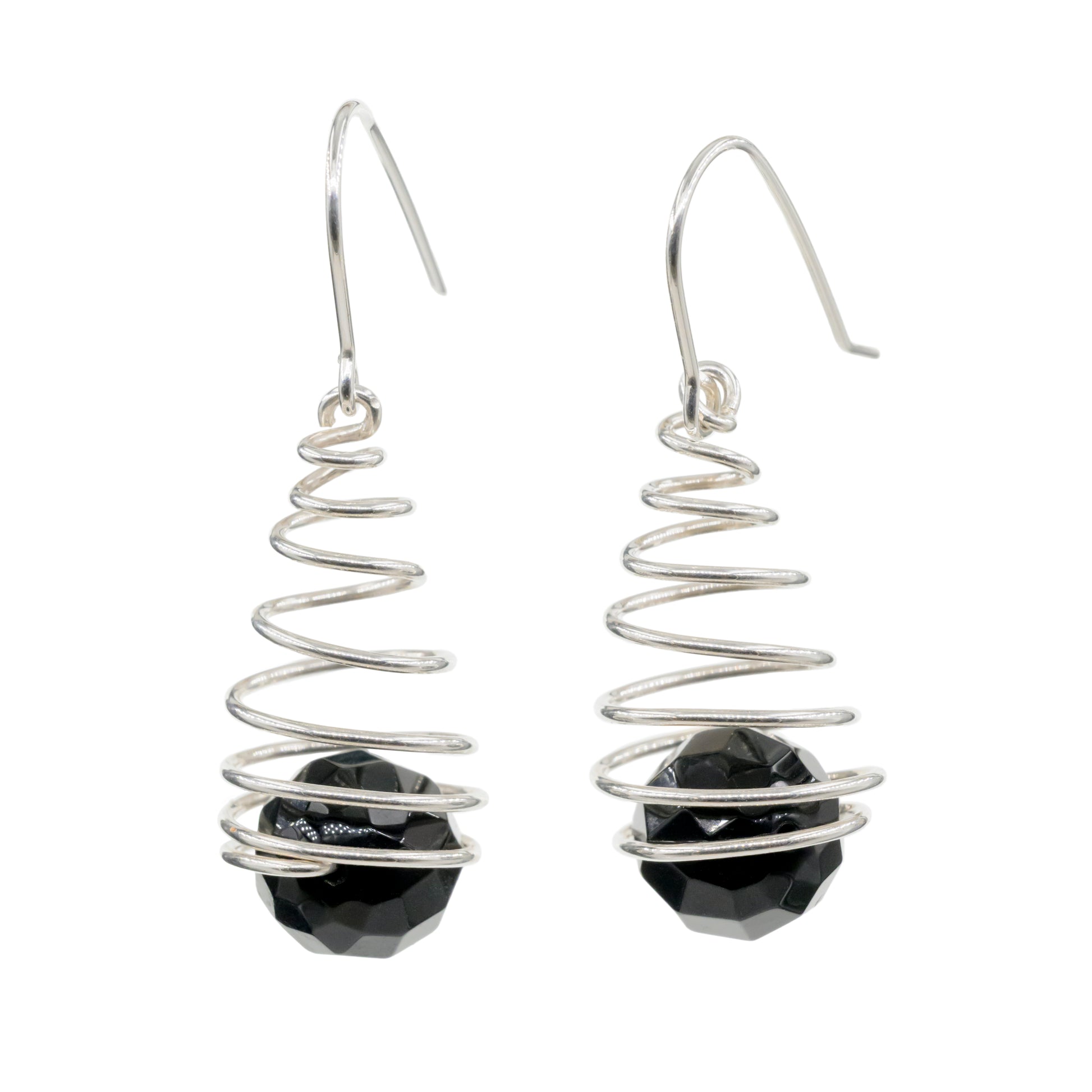 A pair of teardrop spiral earrings with black, faceted onyx beads, handmade from twisted sterling silver.