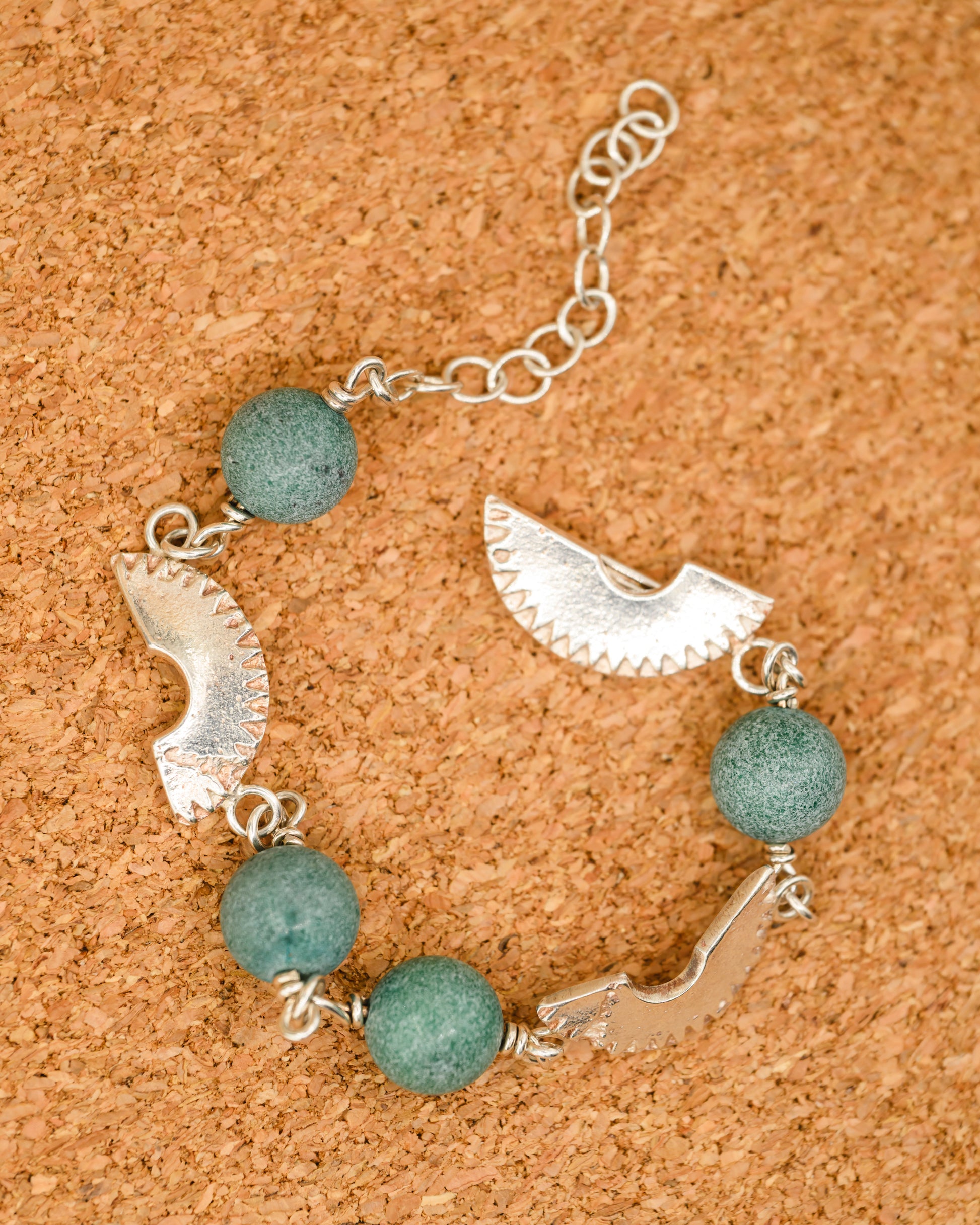 Silver bracelet with compass discs and beautiful stones of green moss jasper.