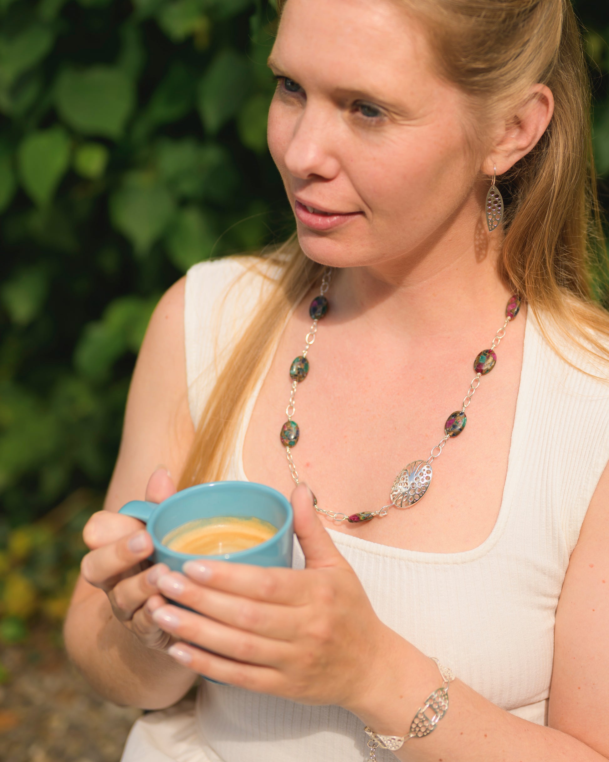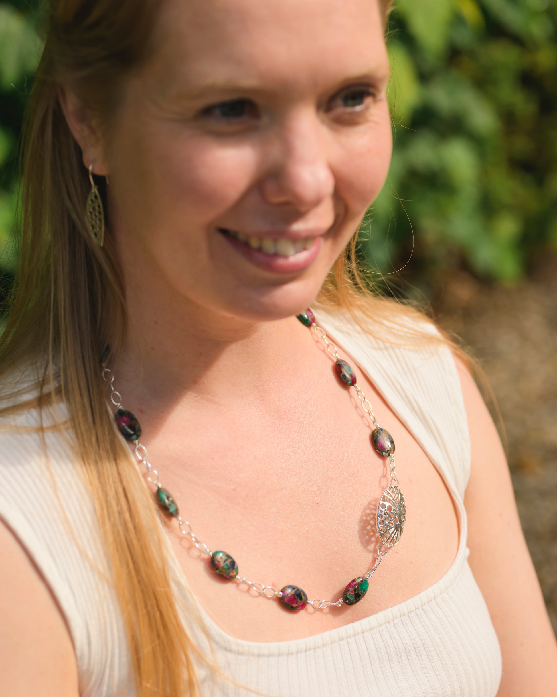 Halskæden er 62 cm lang og passer til kvinder der ønsker at kombinere tidsløst, unikt og håndlavet design med en øget forbindelse med naturen omkring dem. Smykkerne kan bæres til både hverdag og fest.