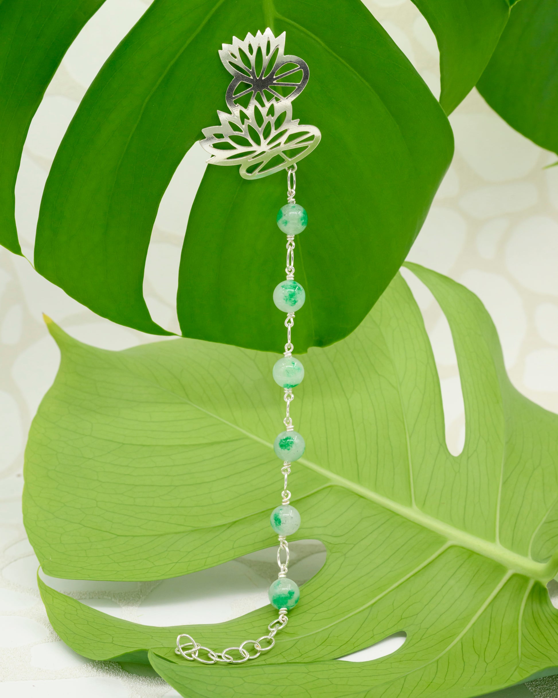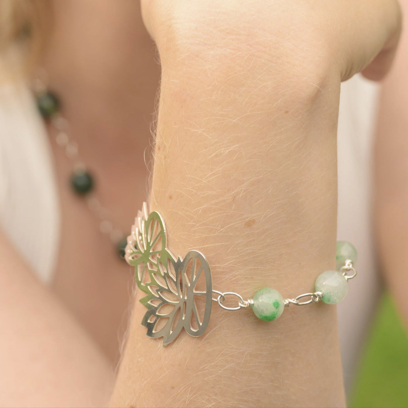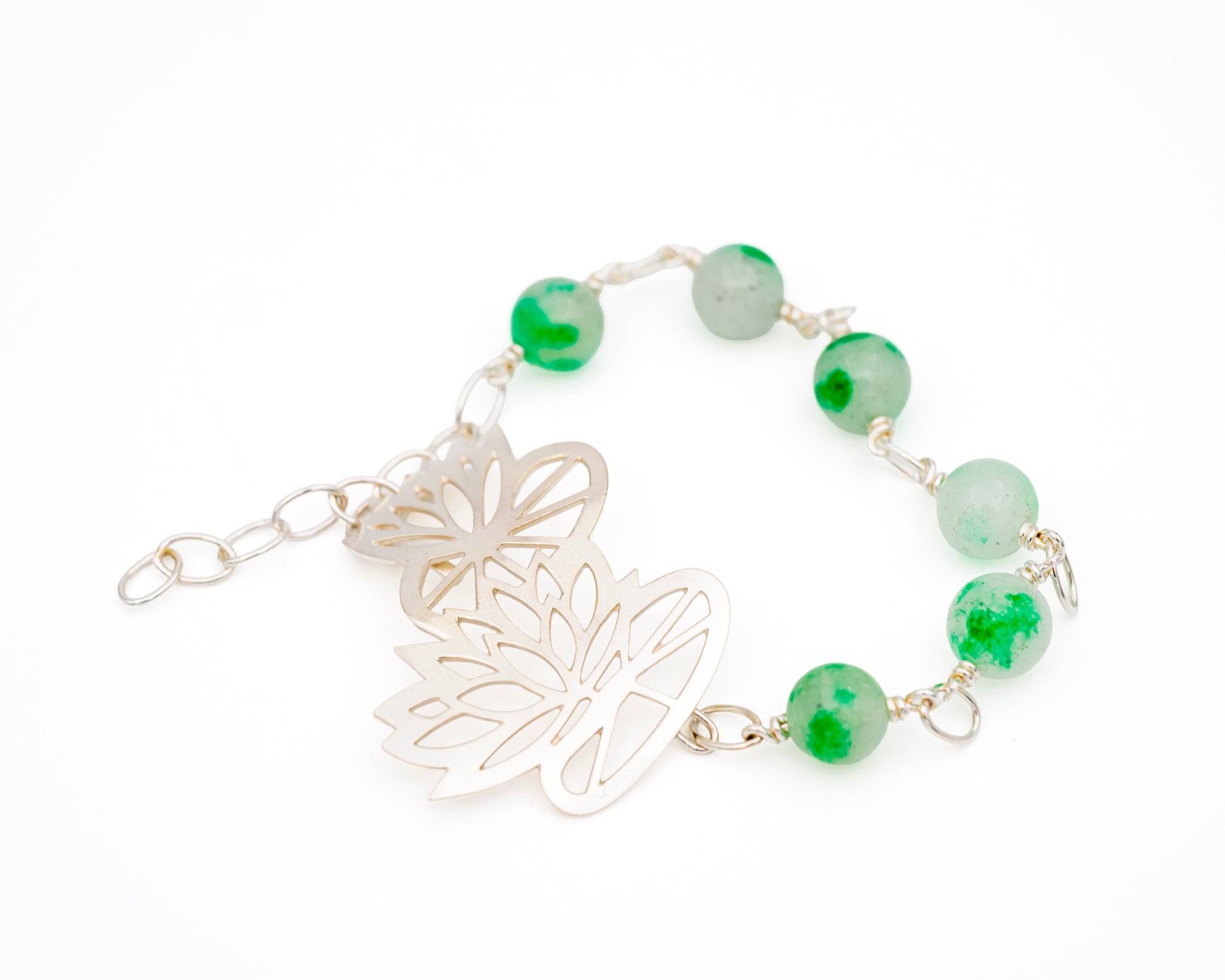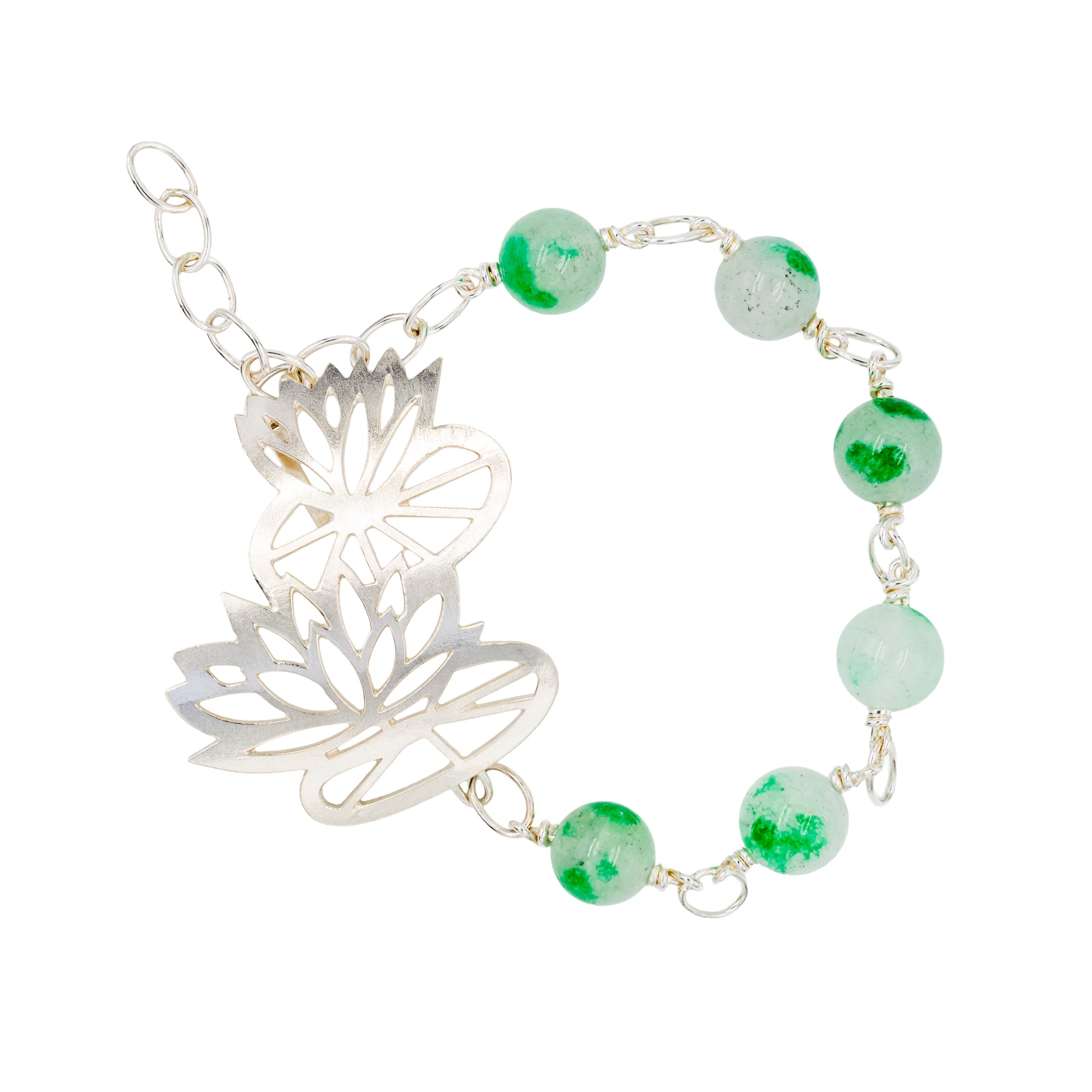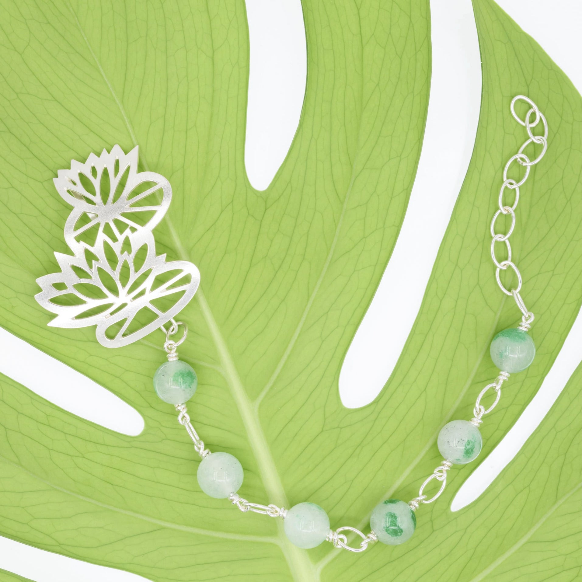 Monet & Me armbånd med aventuriner, håndlavet af Therese Følsgaard i sterling sølv og inspireret af naturens blomster. Armbåndet består af en sølvkæde med aventuriner, afsluttet af en åkande af sterlingsølv.
