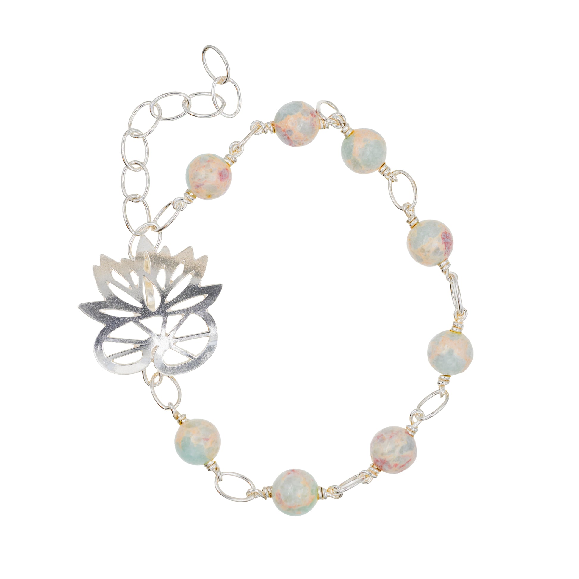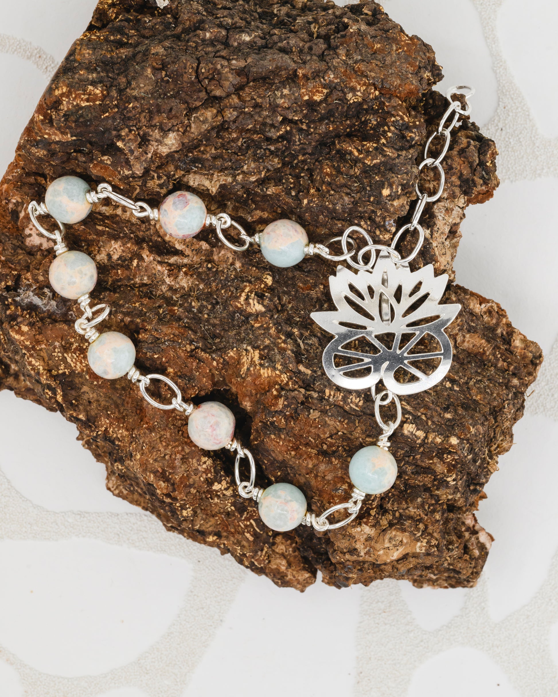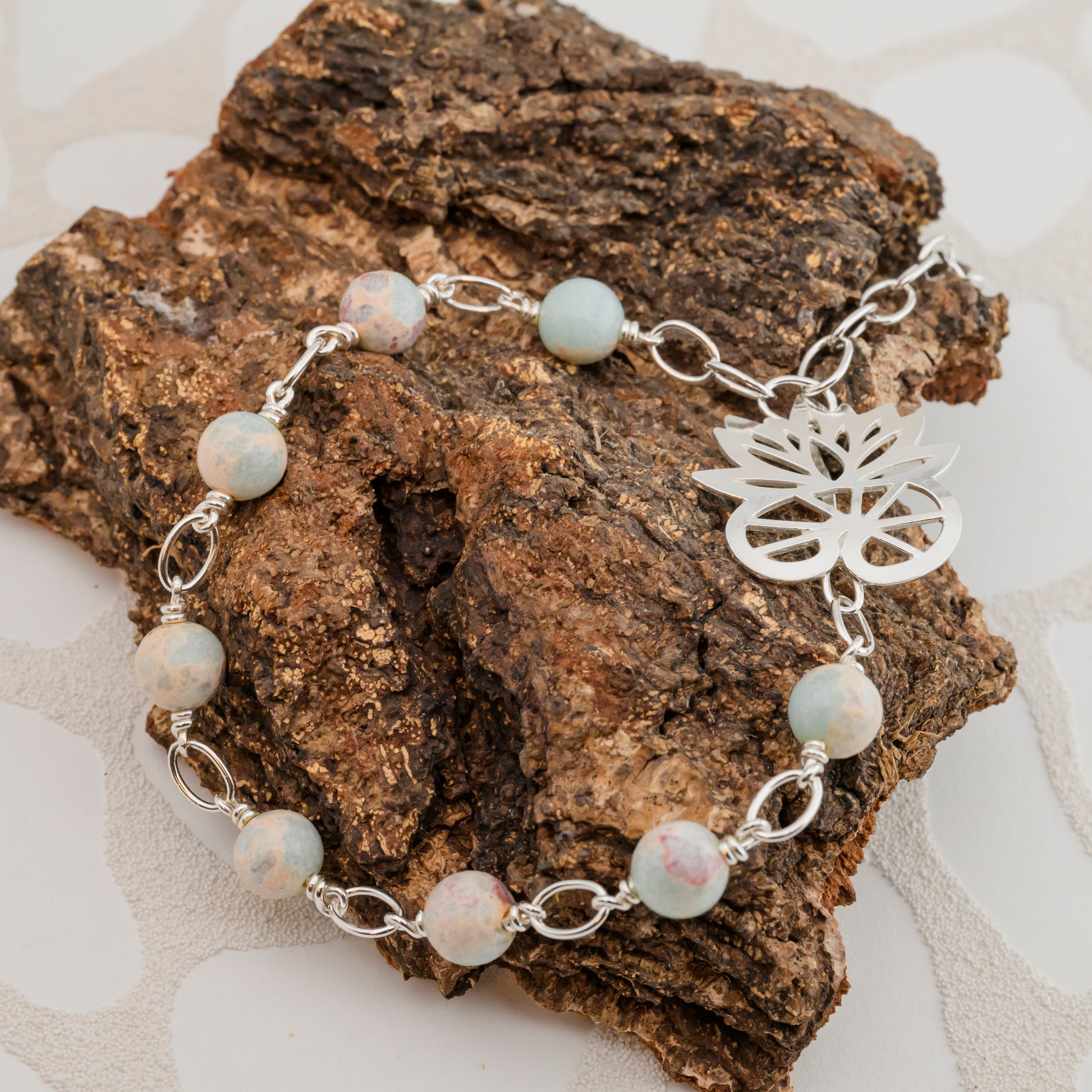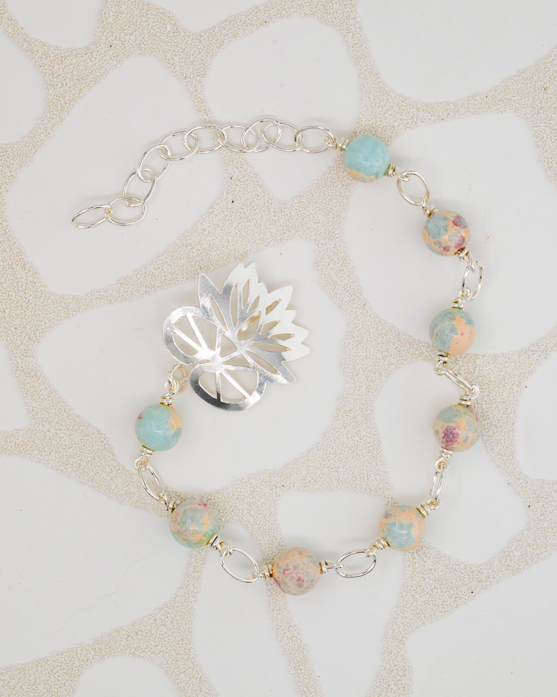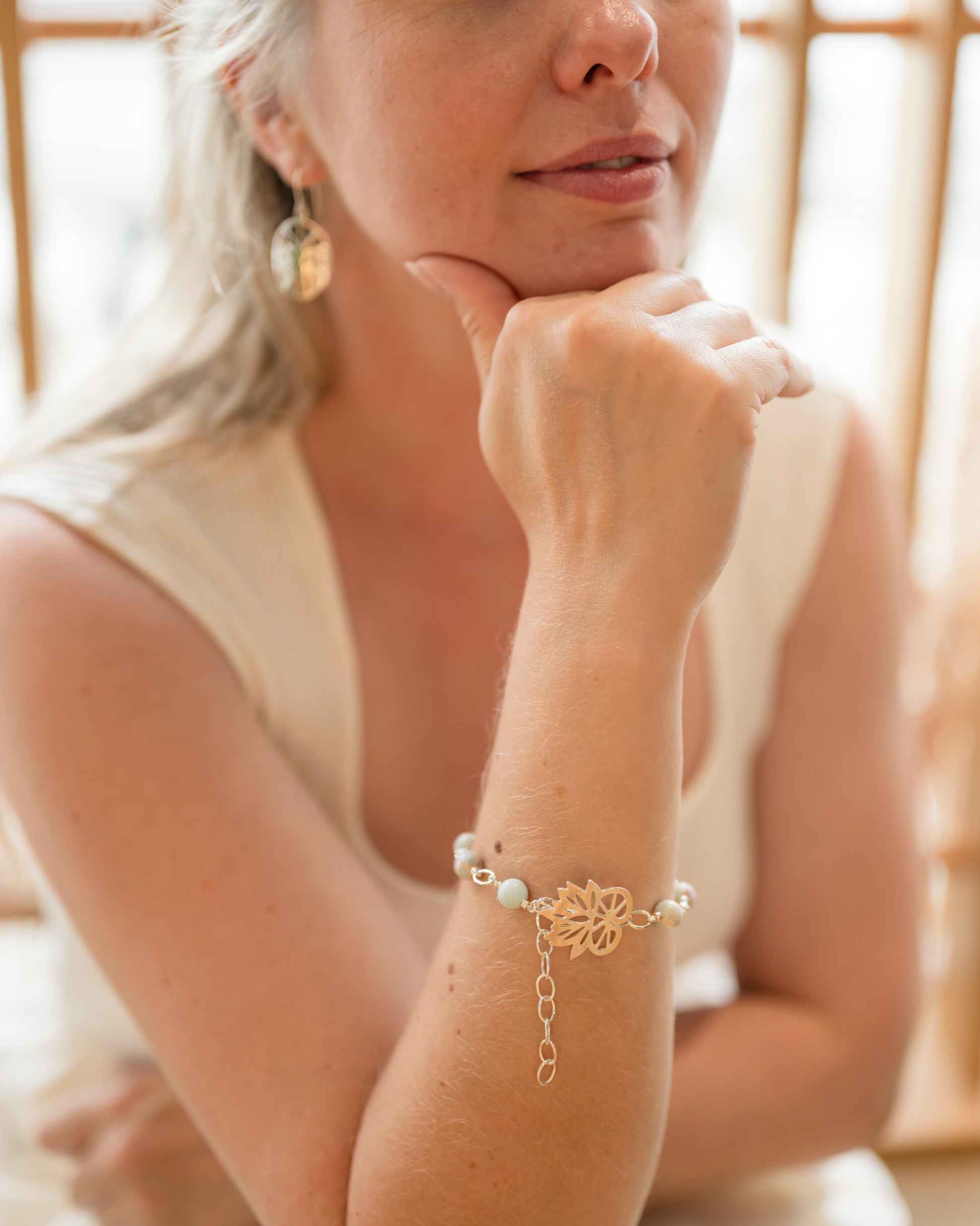 Der findes kun dette ene Monet & Me armbånd med Amazonit, håndlavet af Therese Følsgaard i sterling sølv. Armbåndet består af en sølvkæde med naturstenen amazonit, afsluttet af en åkande af sterlingsølv.