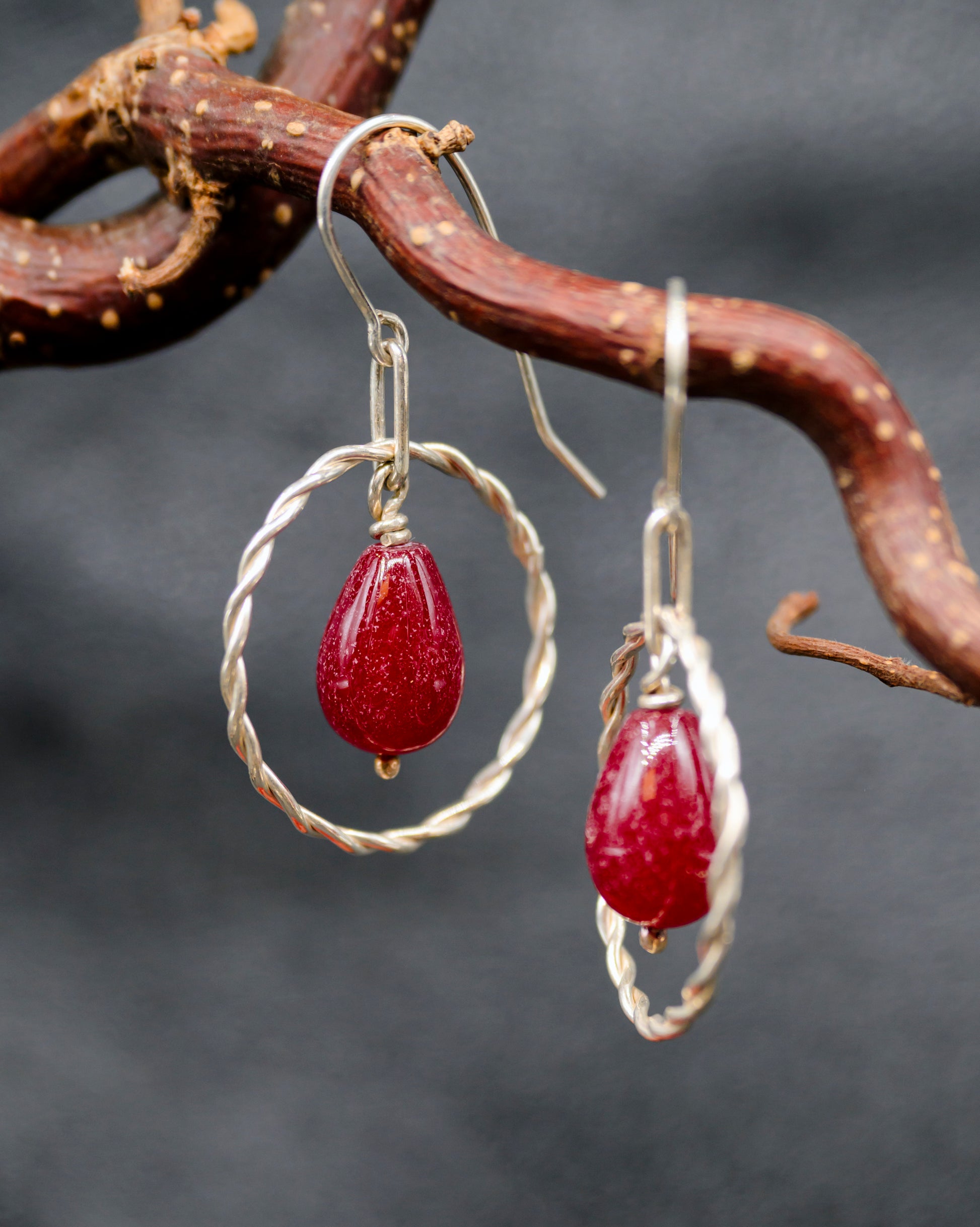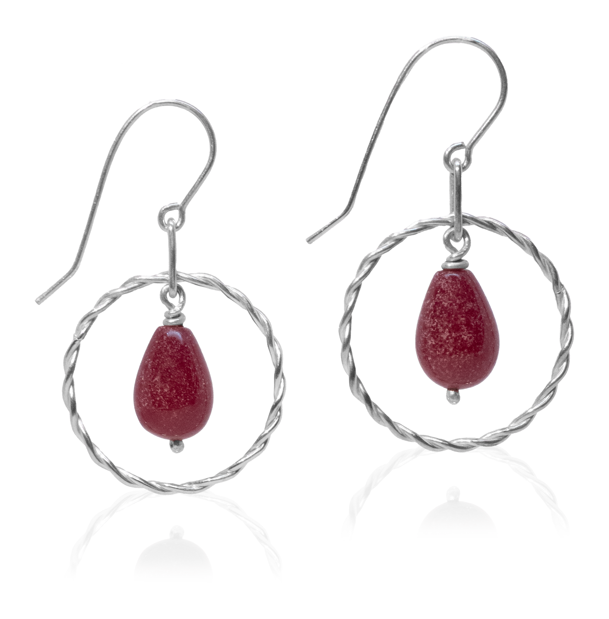 Et par fine sølvøreringe med røde dråbeformede glasperler, omkranset af en snoet ring og ophæng i sterlingsølv, der får de små sten til at ligne miniatureplaneter, der svæver i en elegant sølvcirkel.