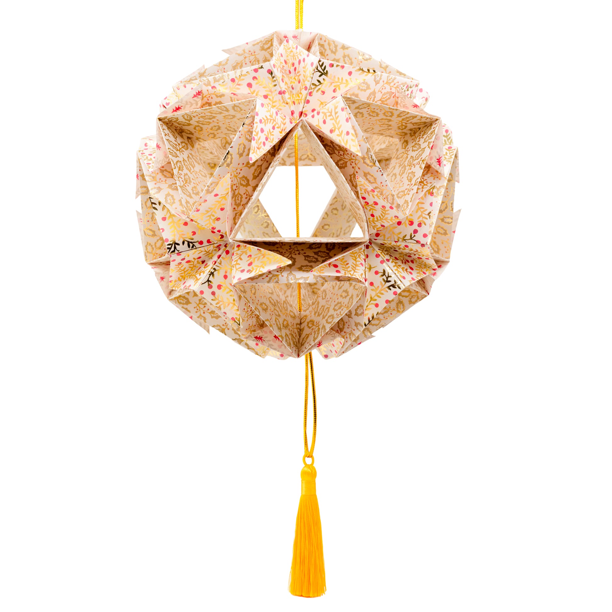En let og elegant jule-globe, håndlavet af foldet papir. Globen er knap 20 cm i diameter, og måler med ophæng ca 47x20 cm. Denne udgave er med guldophæng og kvast, foldet af lyst hvidt papir med fine detaljer af guld og røde bær. Hæng den i vinduet eller andre steder i hjemmet.