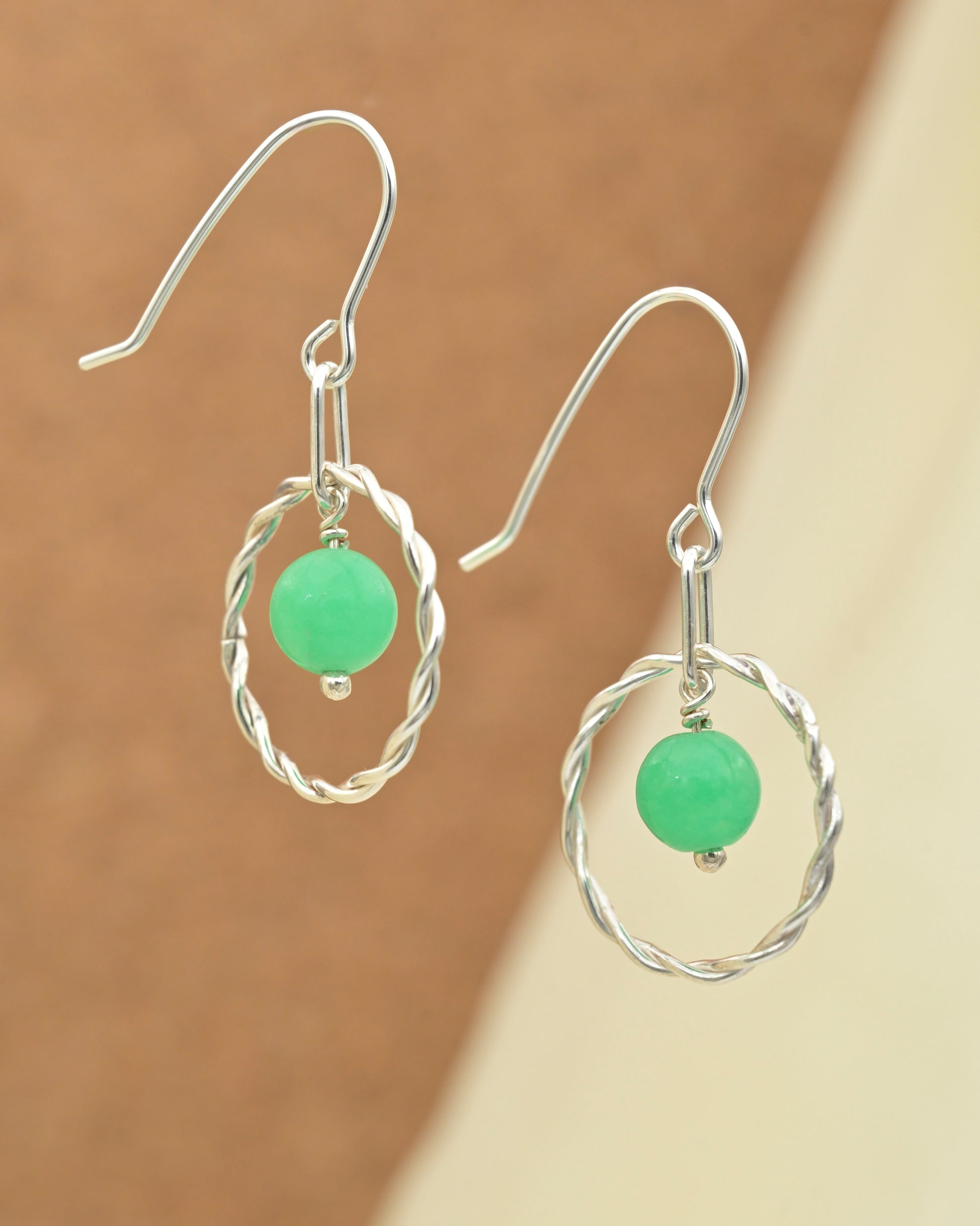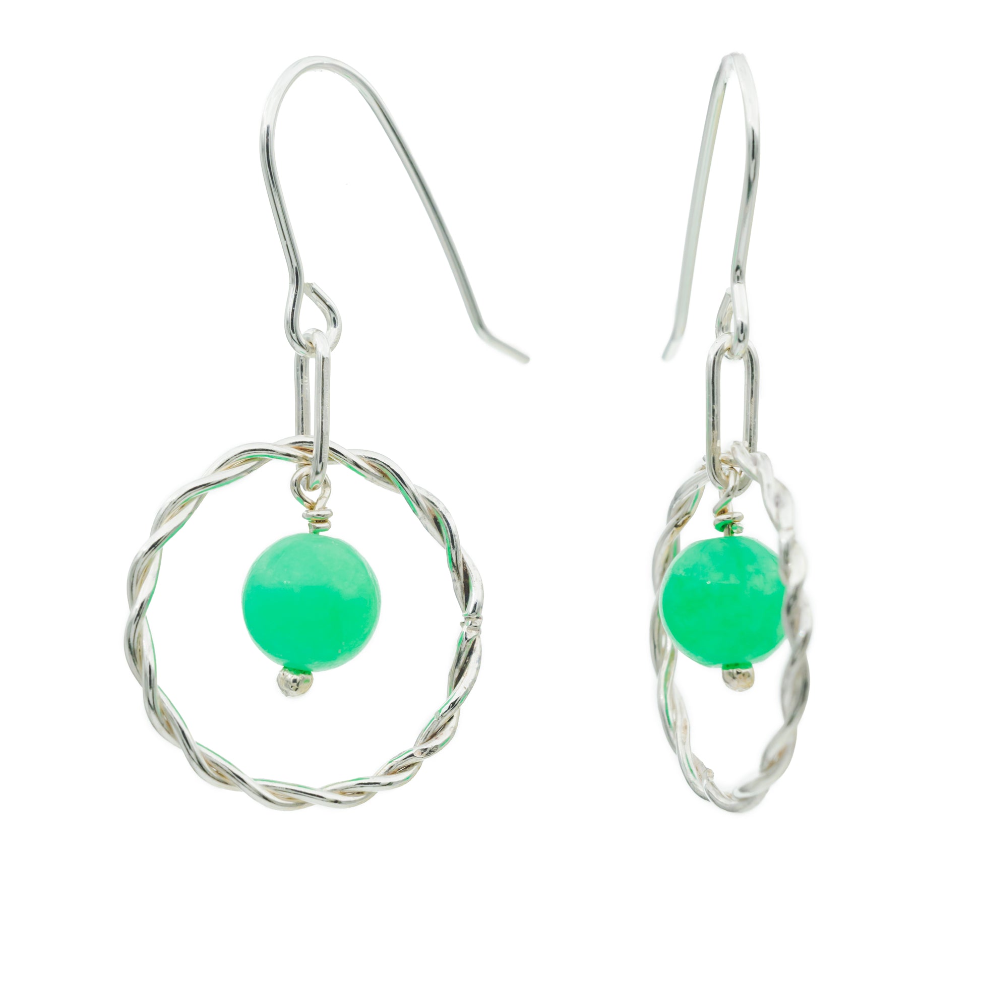 Et par fine sølvøreringesmukke lysegrønne sten af katteøje, omkranset af en snoet ring og ophæng i sterlingsølv, der får de små sten til at ligne miniatureplaneter, der svæver i en elegant sølvcirkel, der måler ca 2 cm i diameter.