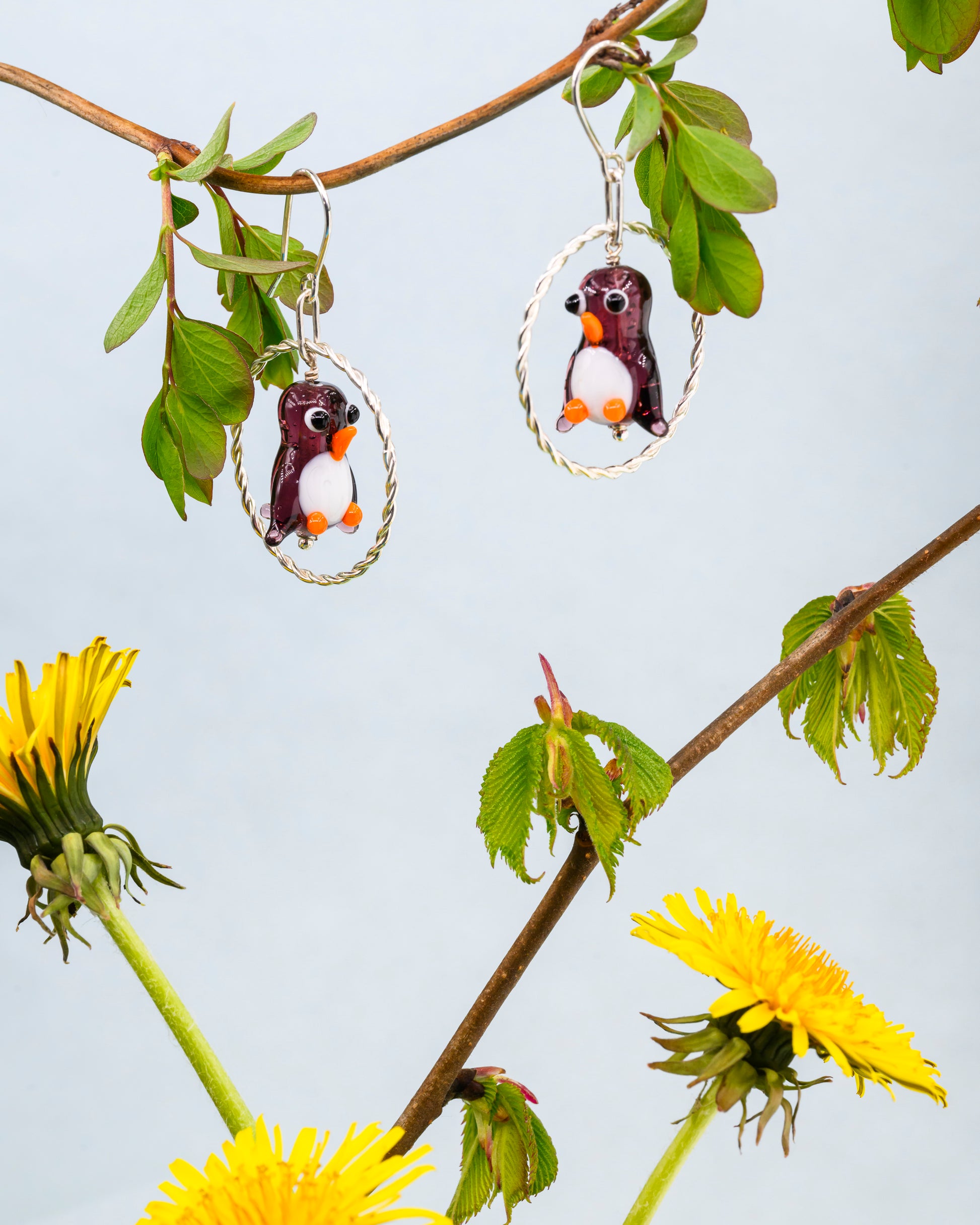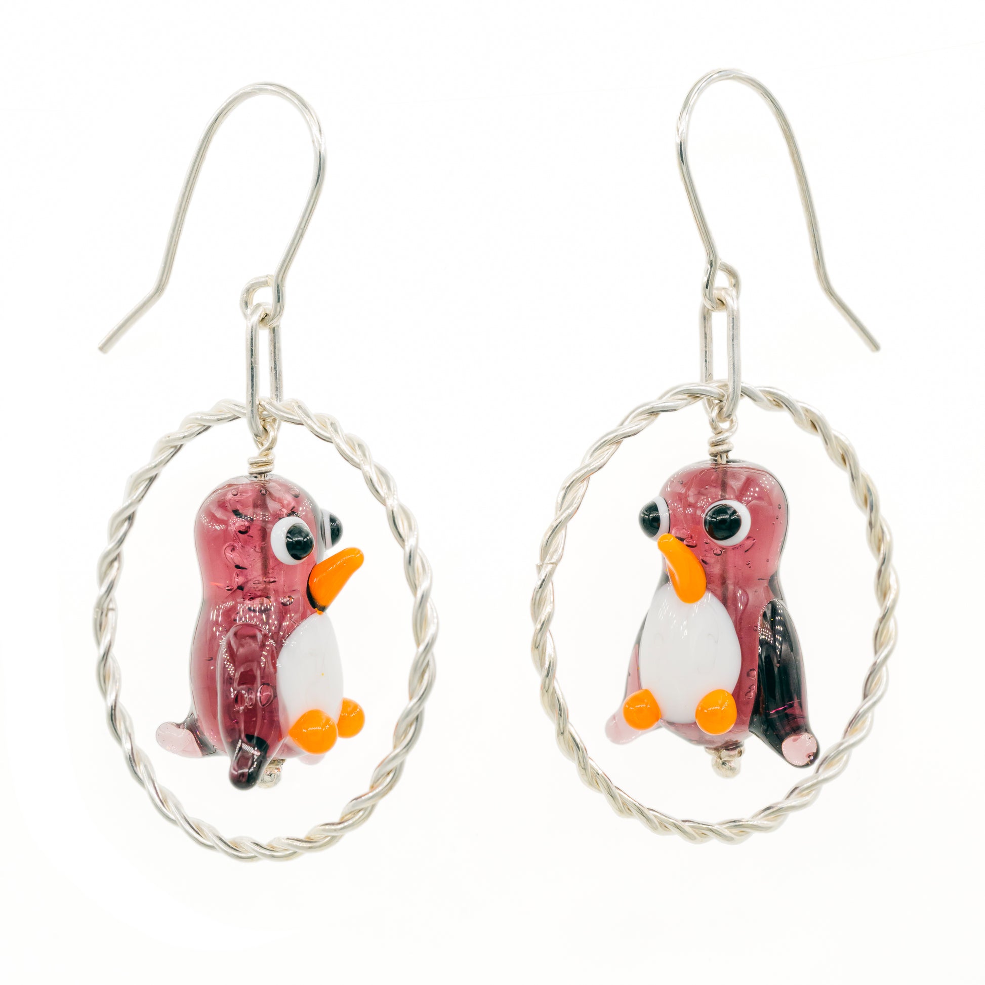 Et par helt unikke ørehængere med bordeaux pingviner i håndlavet glas, med en håndlavet snoet ring og ophæng i sterlingsølv. Der er kun lavet et enkelt par i denne farve.