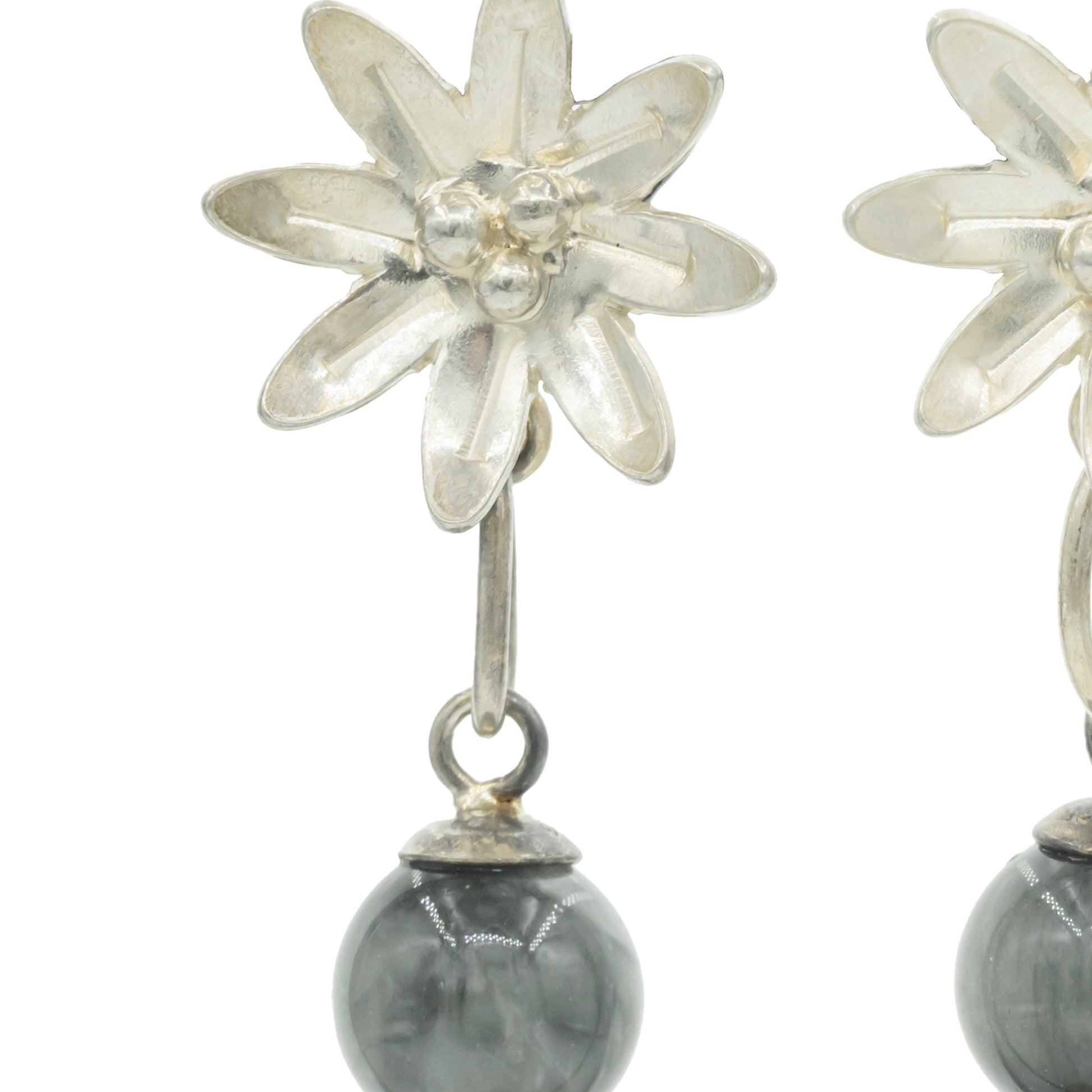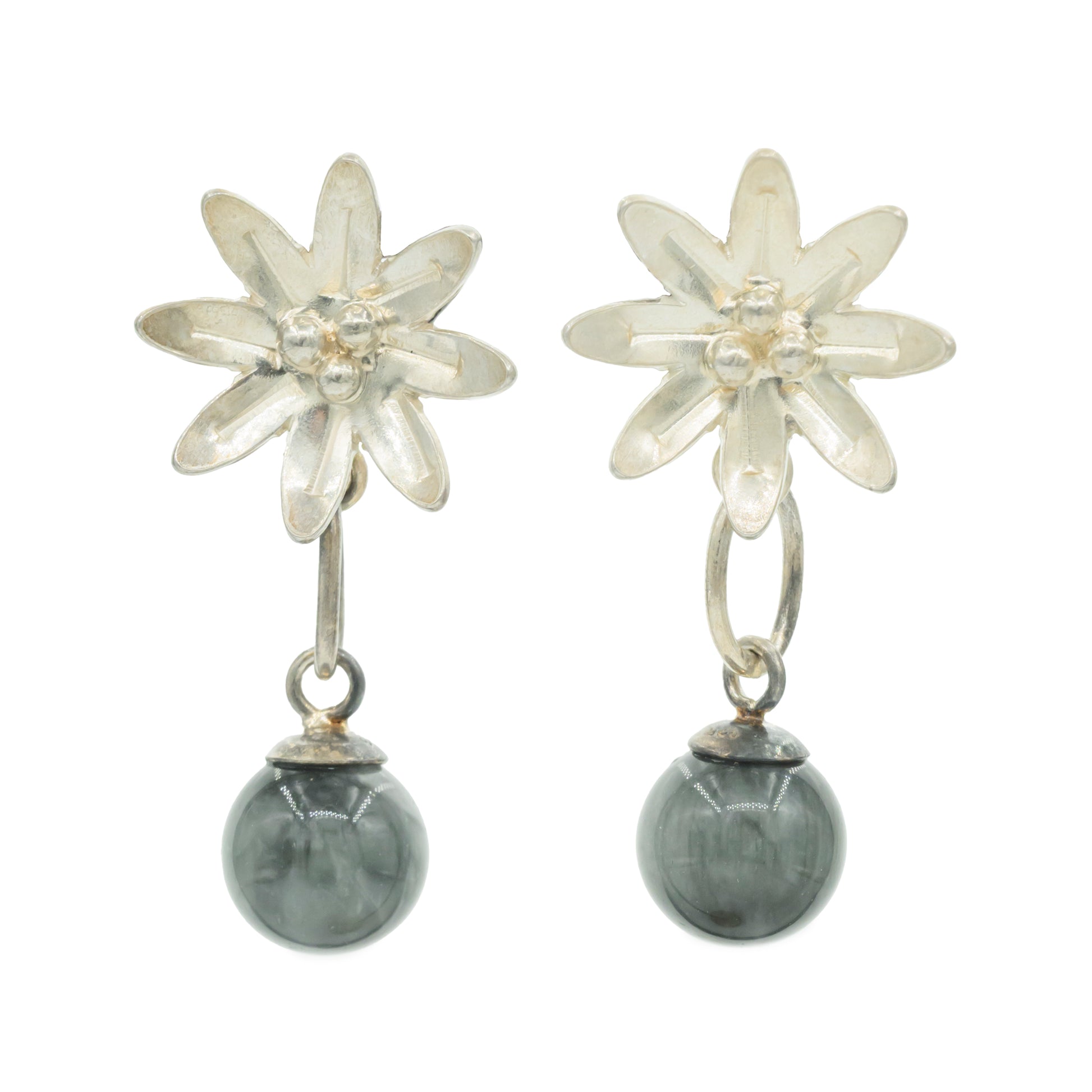 Yvonne Lille ørestik med ørneøje er et blomsterdesign håndlavet af sterling sølv med vedhæng af natursten. Blomsterdesignet er både feminint og elegant, og de hængende sten tilfører en ekstra dimension af farve og bevægelse.